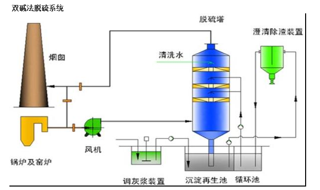 為了克服石灰/石灰石法容易結(jié)垢和堵塞的缺點(diǎn),發(fā)展了雙堿法。該法先用可溶性的堿性清液作為吸收劑吸收,然后再用石灰乳或石灰對(duì)吸收液進(jìn)行再生。反應(yīng)如下:脫硫過(guò)程